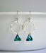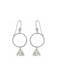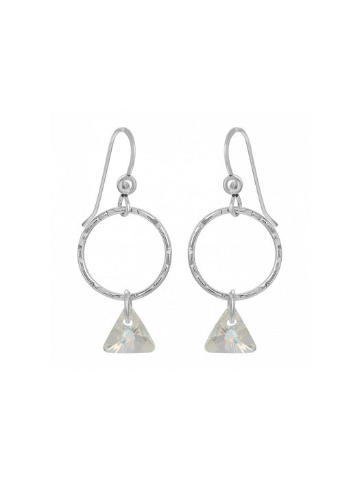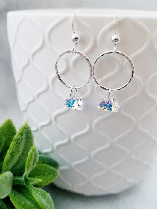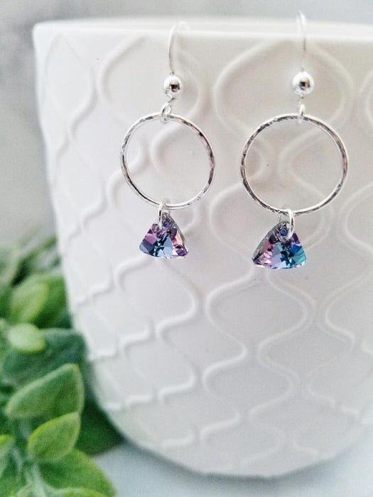 These stunning earrings feature a hammered circle of sterling silver with a triangle shaped faceted Swarovski crystal dangle drop. 1 3/8" long.