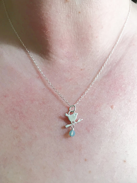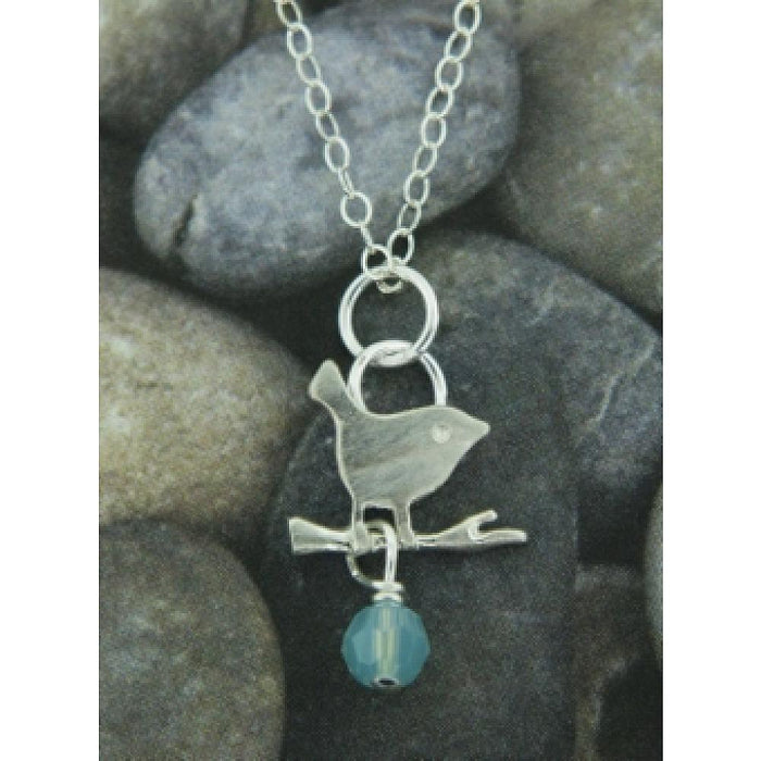 Tweet tweet! A little songbird rests on a branch with a small blue bead of pacific opal Swarovski crystal hanging below in this charming necklace, The bird has a soft matte finish perfect for spring & summer.