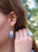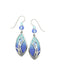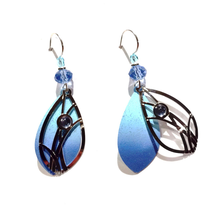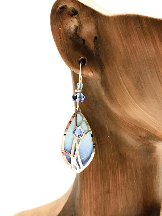 These beautiful earrings have two parts: an enameled blue petal drop with a wispy silver overlay. A blue glass gem adds sparkle.