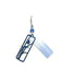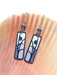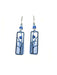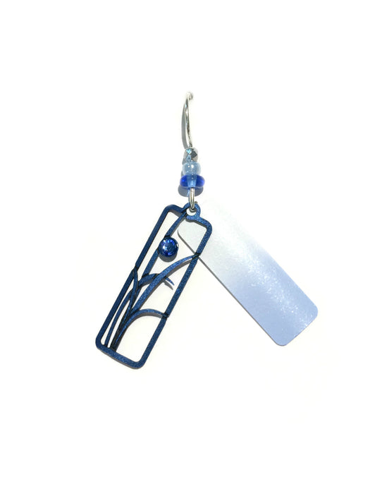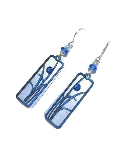 A long column is enameled in ombre tones from white to blue with a dark blue overlay piece cut out with a bold leaf pattern, and set with a sapphire-colored crystal. Glass beads embellish the sterling silver ear wires. These earrings are handmade in the USA!