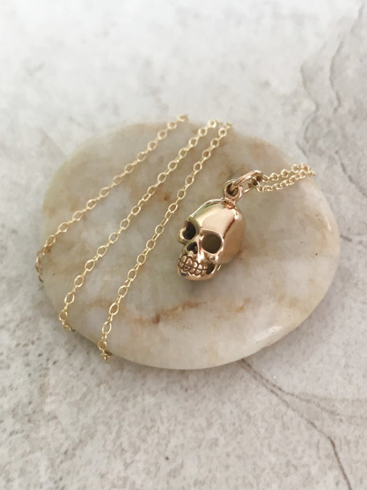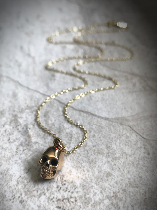 This necklace has a pendant of a realistic bronze skull, ready for spooky season!