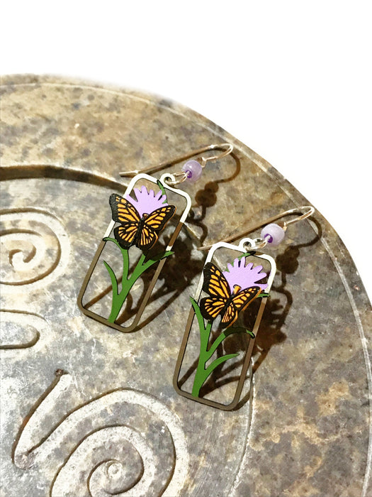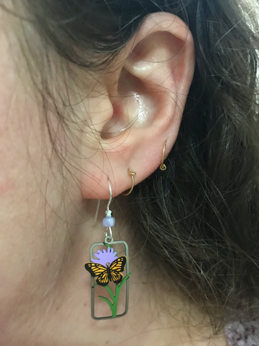These elegant dangles are a steel column shape with a flower background, with a three-dimensional blue butterfly resting on the pink flower. Crafted in lightweight metal with vibrant enamel.
