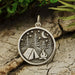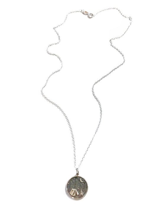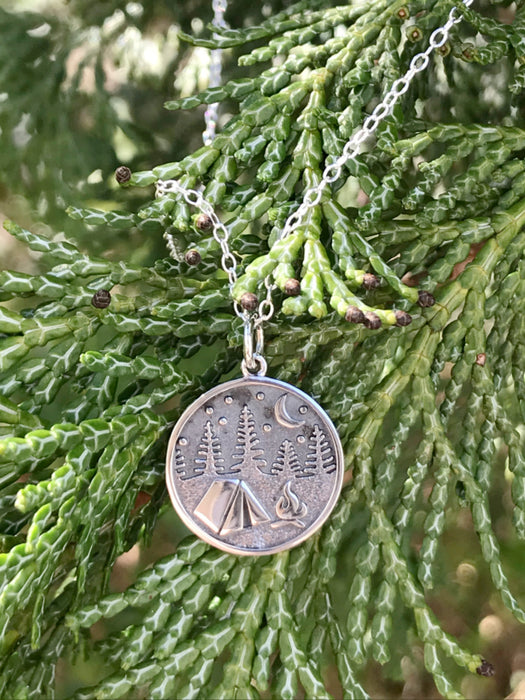 This pendant necklace features a sterling silver medallion with a quaint camping scene, including tent, campfire, trees, moon & stars. The combination of shiny & oxidized silver gives depth & dimension.