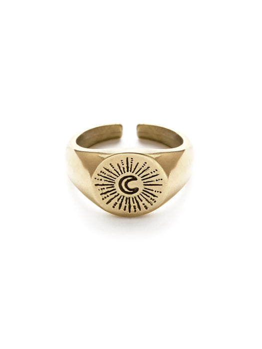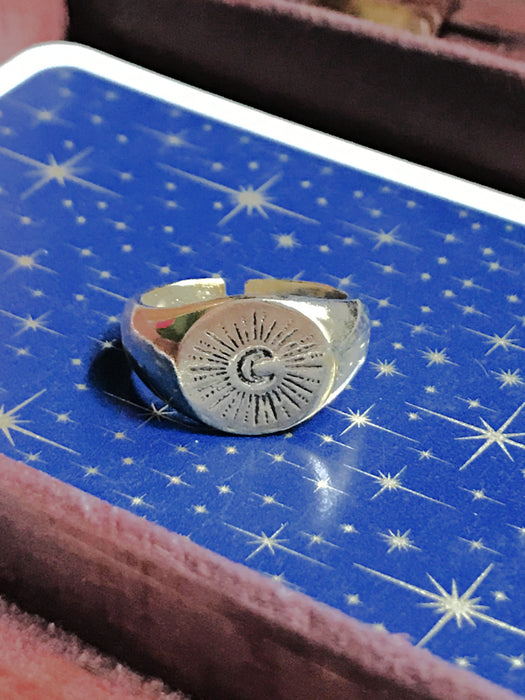 These sturdy celestial rings are cast in jeweler's brass. Cast as a size 7 but adjustable up or down a size by gently opening or closing to fit.