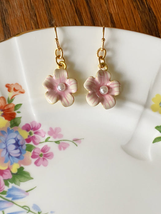 These fresh cherry blossom earrings are beautifully crafted with soft pink & white enamel details and set in the center with a freshwater pearl.