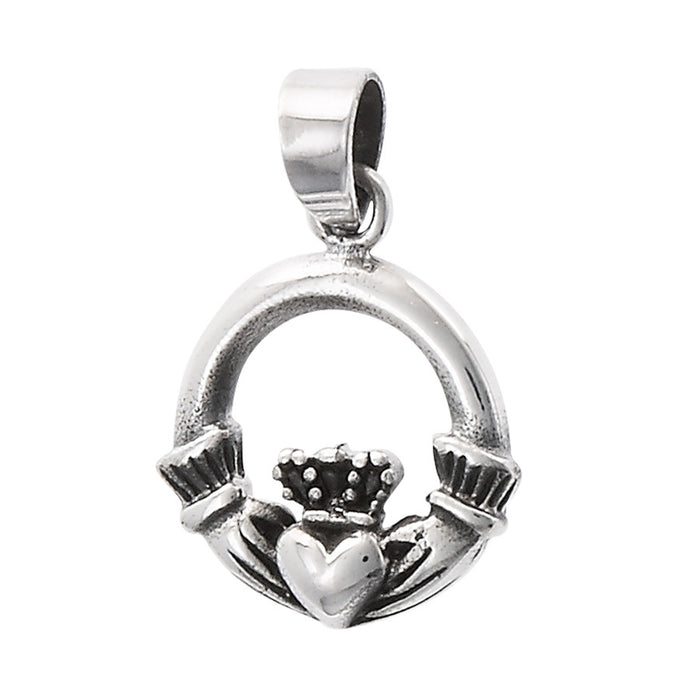 This classic pendant featured the traditional Irish Claddagh design. This design represents love (heart), loyalty (crown), and friendship (hands).