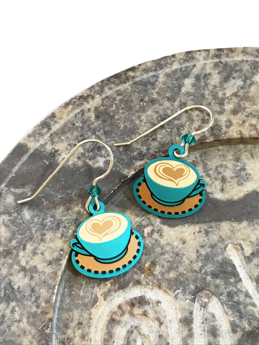 The sweet dangles are little cups of cappuccino with hearts in the foam. Made of vibrant teal & brown enamel on lightweight metal, these earrings are handmade in the USA by Sienna Sky! Bright blue crystals embellish the sterling silver ear wires.