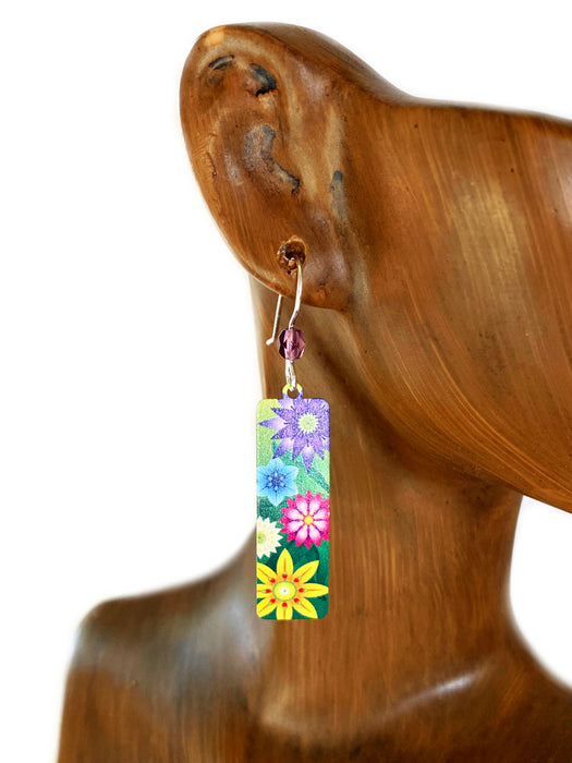 These bold statement earrings feature a long column enameled with a vibrant image of bursting flower blossoms in a variety of colors against a field of green.