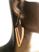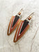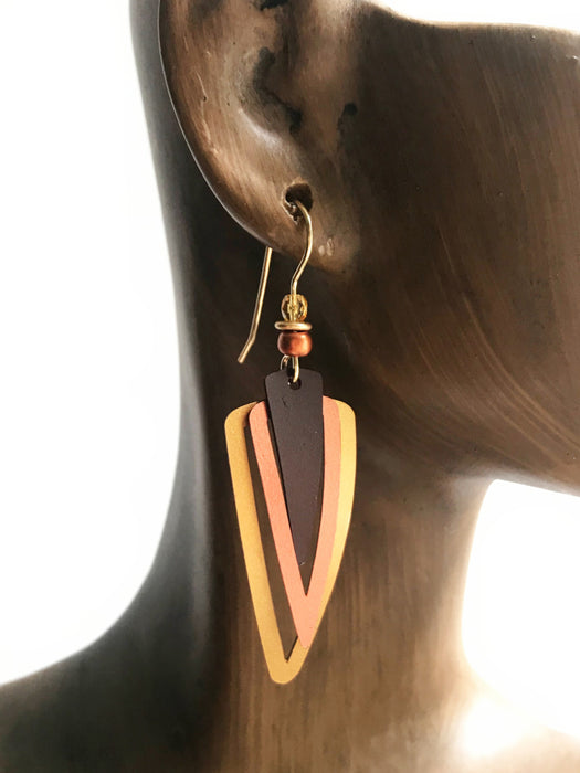 These dangle earrings feature three steel triangles enameled in shades of copper and brown freely hanging for graceful movement.