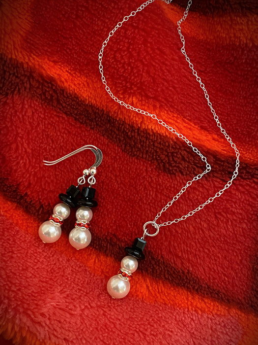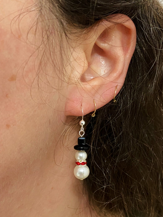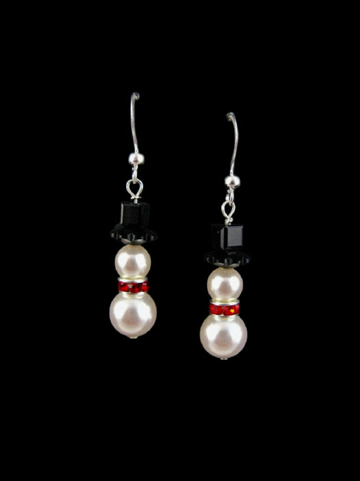 These adorable snowman earrings are a beaded stack of Austrian crystals including white pearls for the body and red crystal scarf. A black top hat caps off the stack.