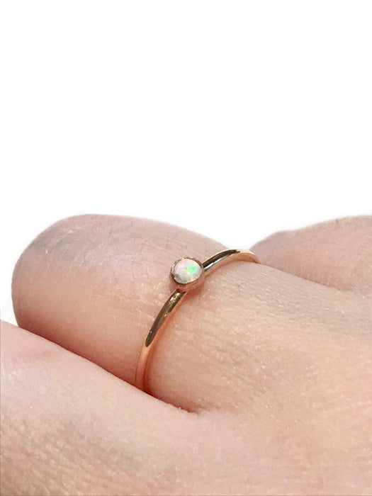 This dainty ring is a dome of white opal bezel-set into a handcrafted 14kt gold filled band. Perfect for stacking!