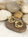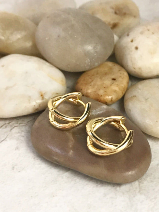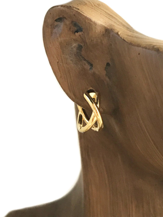 These geometric huggie hoops are two crossed bars making an X-shape. Huggie hoops are hinged at the bottom and click to clasp.