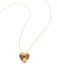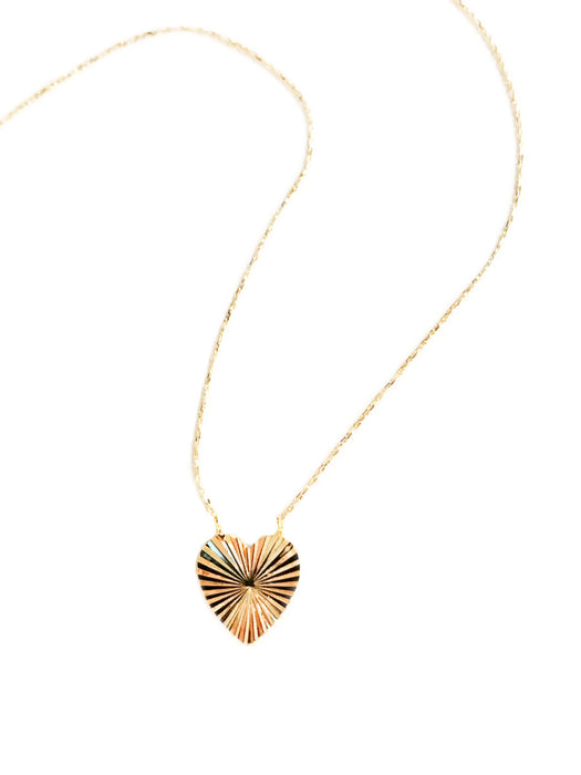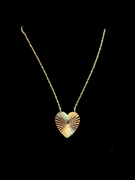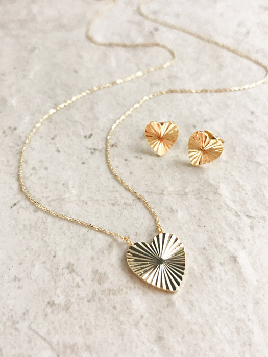 This sweet necklace features a heart centerpiece, engraved with radiating lines from the center for beautiful light play. Attached to each side of the pendant is gold plated serpentine chain. Shown pictured with the matching stud earrings!
