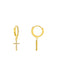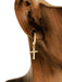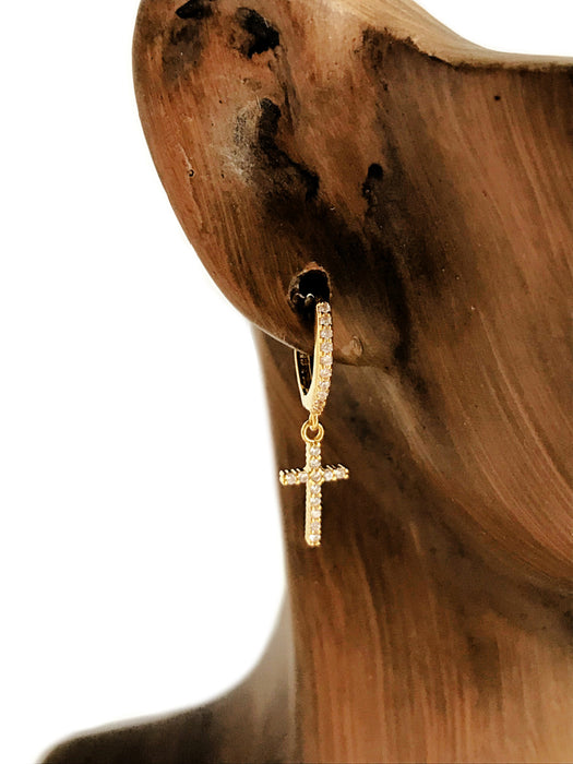 These sparkling earrings are a huggie hoop with a charm of a cross dangle. Both hoop and charm are lined with glittering cubic zirconia crystals. Huggie hoops are hinged at the bottom and snap closed.