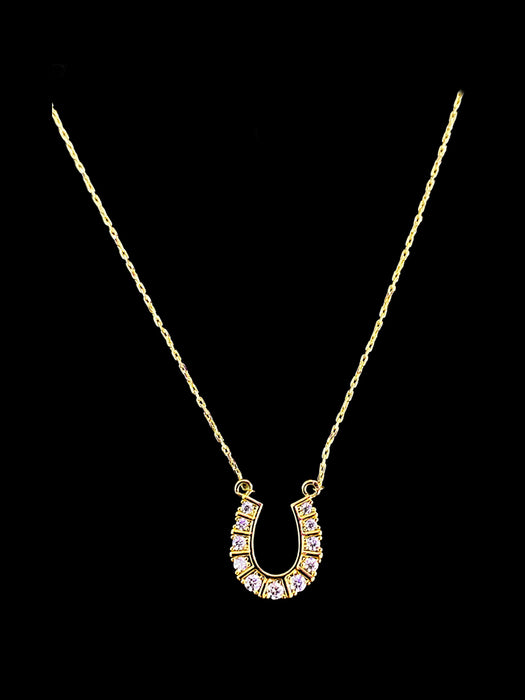 The symbol of the horseshoe has been used as a vessel for good luck for centuries. This necklace is a golden horseshoe centerpiece lined with round glittering CZ crystals, with gold linked chain attached to each side.