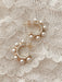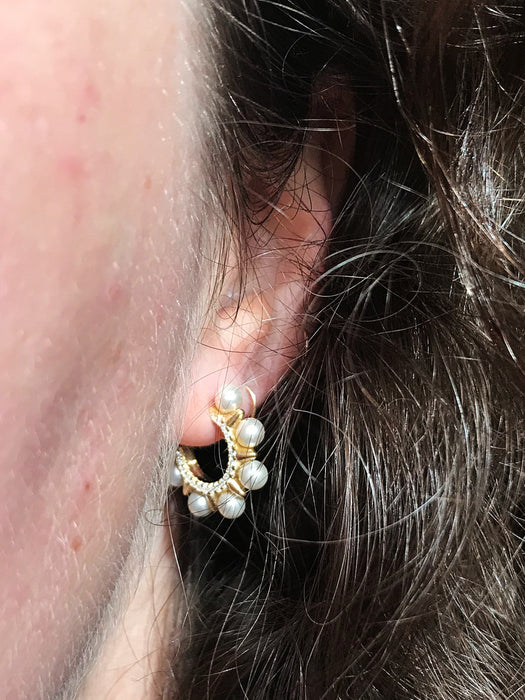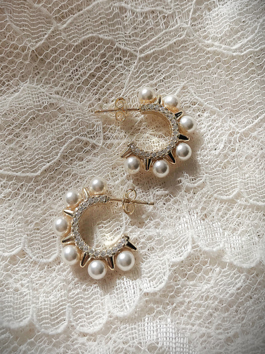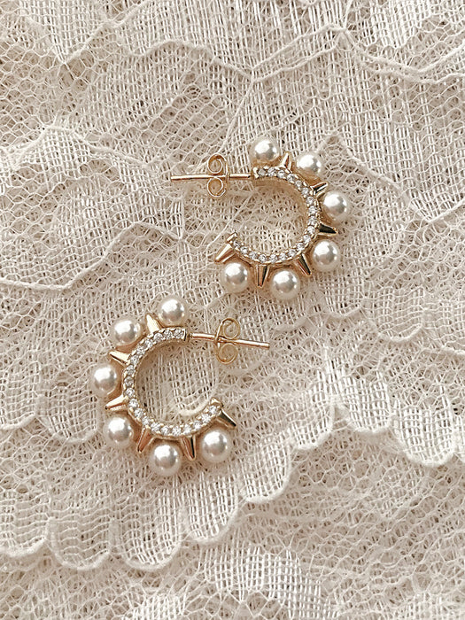 These elegantly edgy stud earrings are a hoop style with a row of clear CZ crystals lining inside and is edged with golden spikes alternating with creamy pearls.