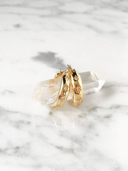 These wide gold hoops are embossed with engraved stars set with twinkling cubic zirconia crystals. Easy pincatch closures.