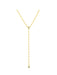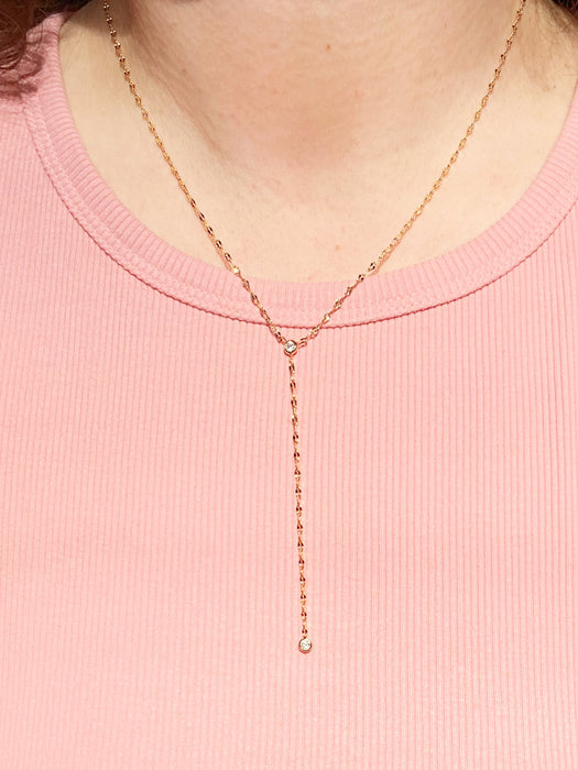 This simply elegant necklace is a classic Y necklace- where the two Gucci style chains meet in the center rests a clear CZ bezel, with a 3.25" drop leading to another bezel set CZ crystal.