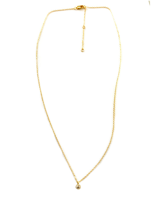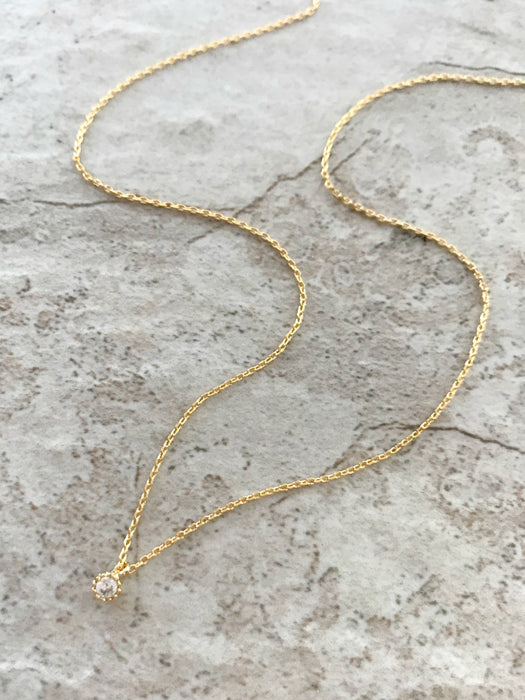 This minimalist necklace features a dainty clear cubic zirconia crystal encased in a crown-style setting.