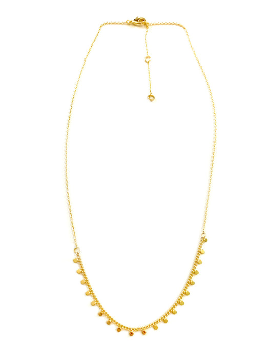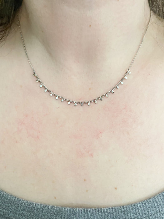 This on-trend necklace features a row of chain with tiny dot dangle motif across the bottom of the necklace. Looks great on its own, or layered with other necklaces!