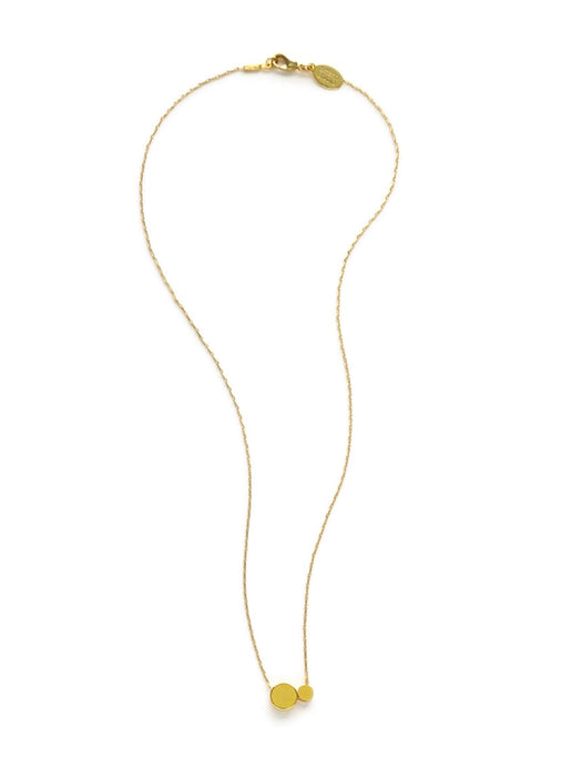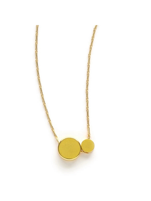 16" long necklace features two matte gold discs on a 14k gold plated chain.