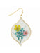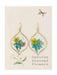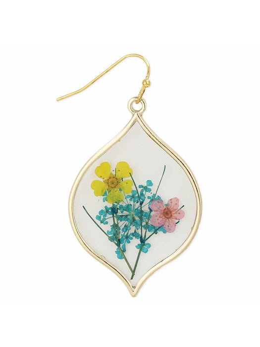 Bring home cottage style with genuine pressed flower jewelry! These delicate gold marquise earrings feature blue, pink and yellow dried flowers and green leaves set in clear acrylic with a gold tone border and ear wires.