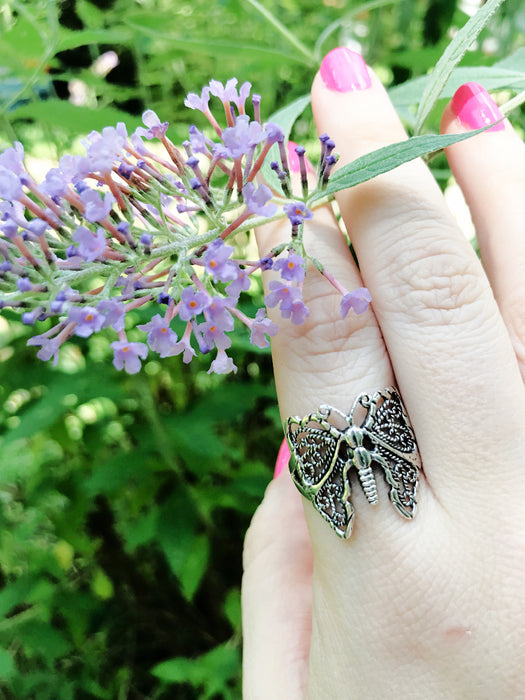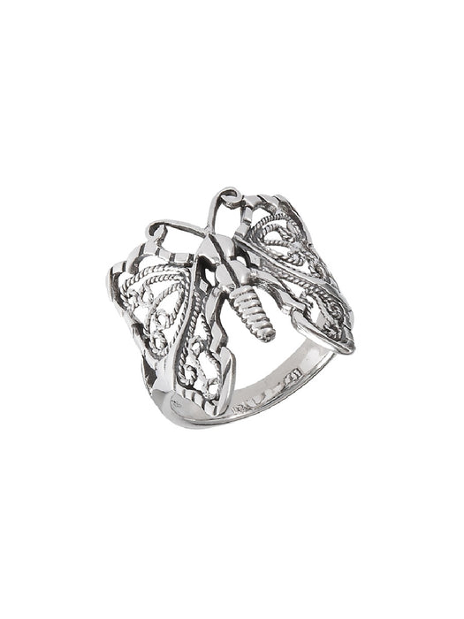 This statement ring is a beautiful butterfly crafted in detail with swirling silver filigree.