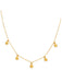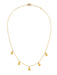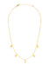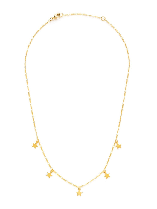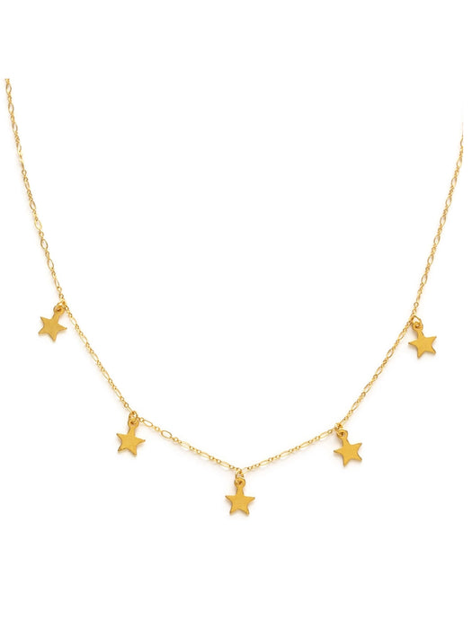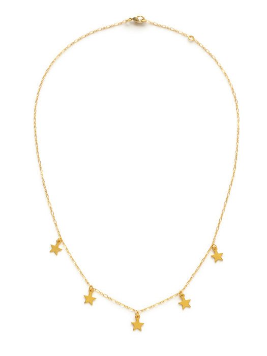 An adjustable 14k gold plated chain has five golden stars spaced at intervals 1" apart.