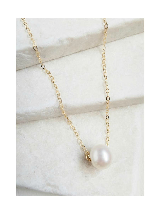 A creamy white pearl floats on an 18" gold filled chain. Pearl is just over 1/4" diameter.