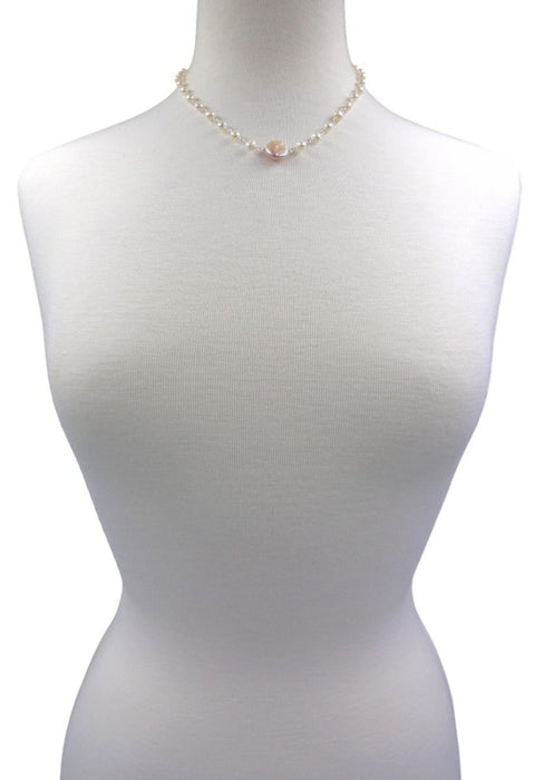 This timeless pearl necklace features white freshwater pearls leading to a pale pink coin pearl centerpiece. Silver plated.