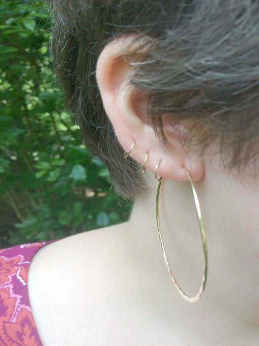 14 karat gold filled hammered hoops. Hammered texture adds a little something special. Pick your size! Gold filled jewelry is made by bonding a layer of real 14k gold over a core of base metal (usually copper & zinc or brass). Gold filled jewelry can last for many years with proper care.