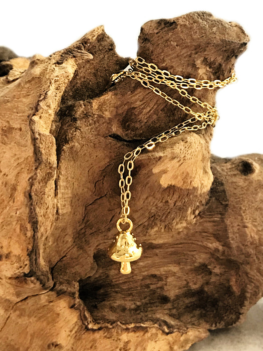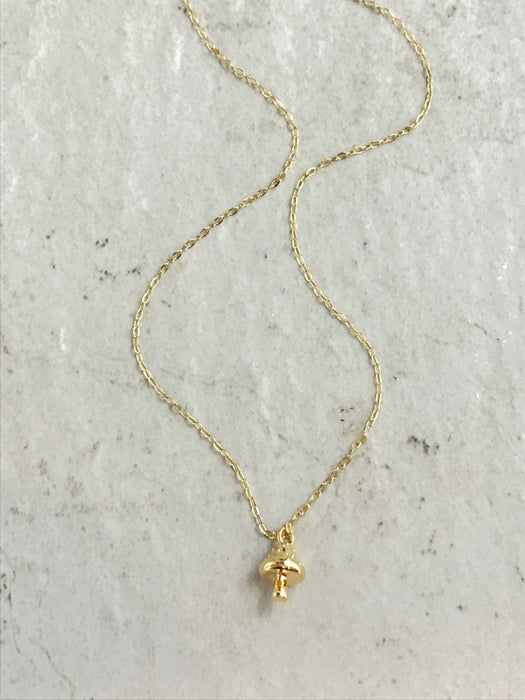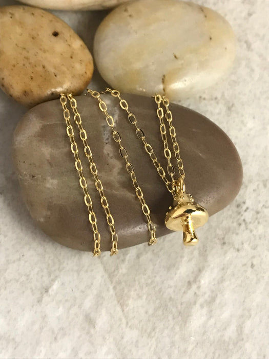 This gold plated chain necklace features a small pendant of a mushroom, with a sweet detailed cap.