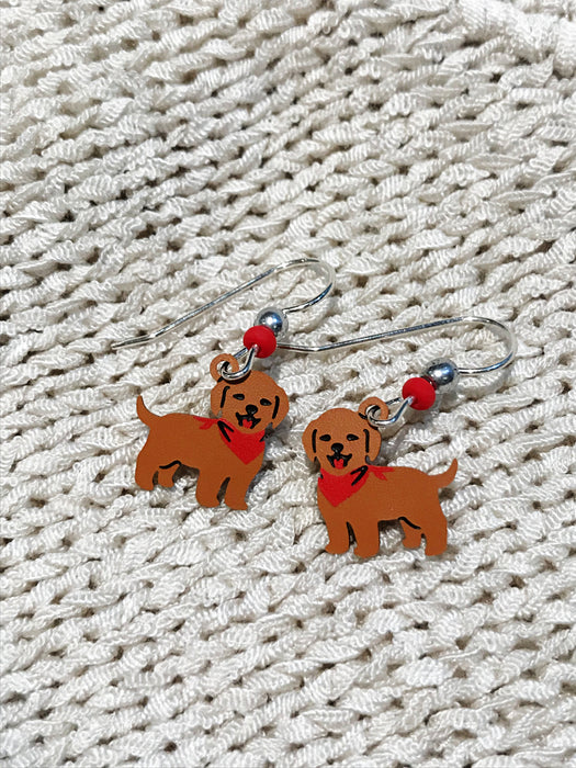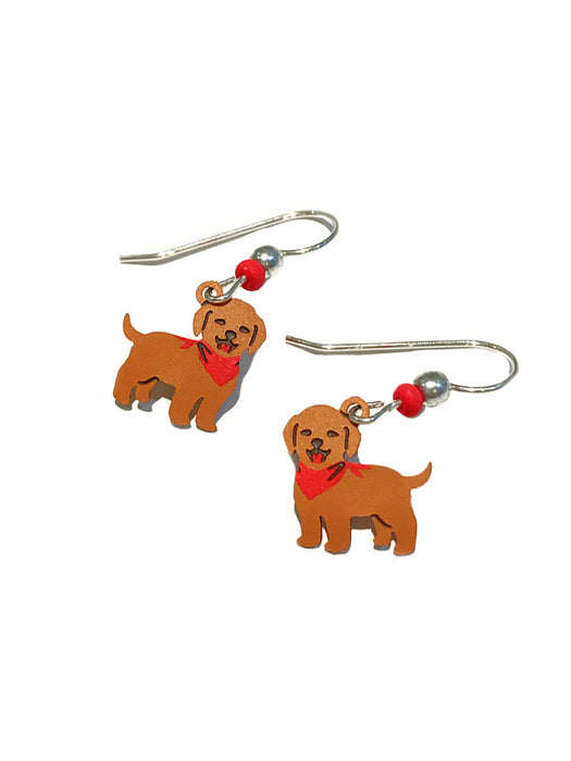 These happy golden retriever puppies have a jaunty red bandana tied around their neck. These earrings are handmade in the USA by customer favorite Sienna Sky. A bright red bead embellishes the sterling silver ear wires.