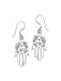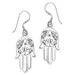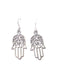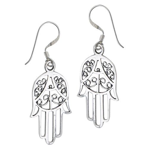 These dangle earrings are a protective hamsa hand, filled with swirling silver filigree.