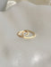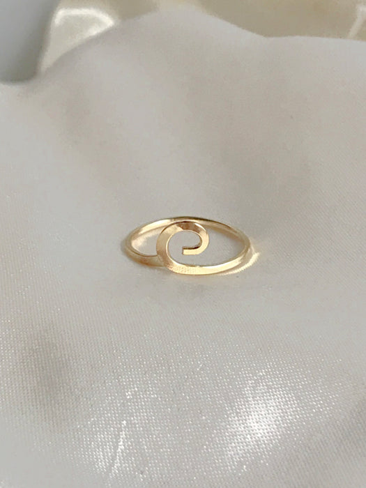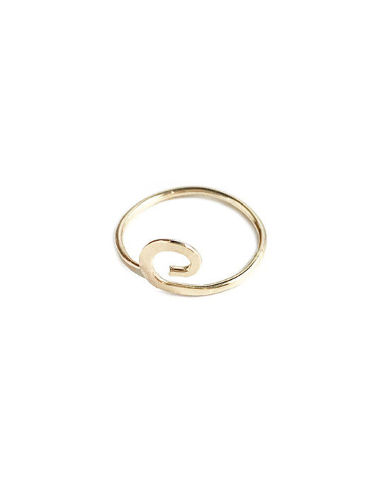This gold filled ring has one curling spiral with a lightly hammered finish on a solid band.