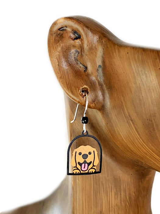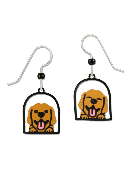 These adorably mismatched earrings feature an arched frame with a sweet golden retriever popping through, one with its eyes open and one closed.