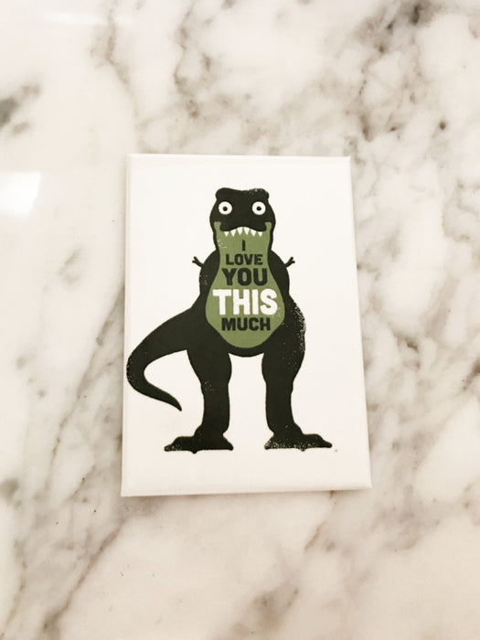 This magnet reads "I love you this much" with an image of a T Rex dinosaur. Made in the USA!