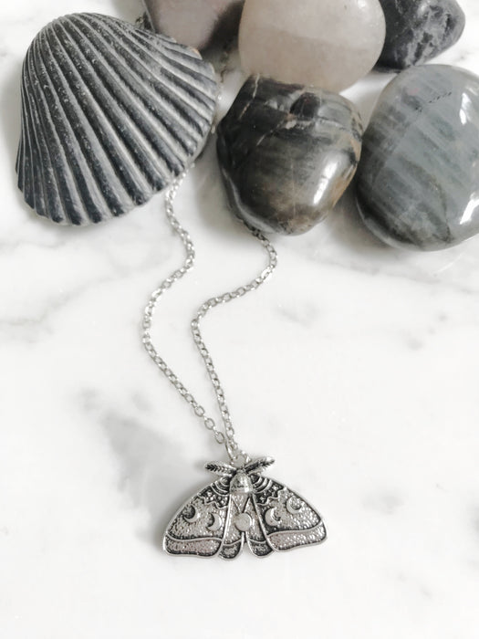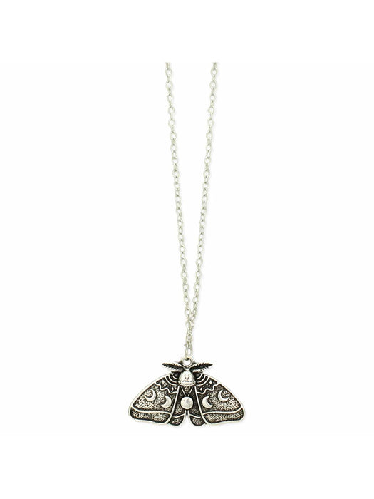 This antiqued silver fashion chain holds a pendant of a Luna Moth embossed with the moon phases across the wings with oxidized details.