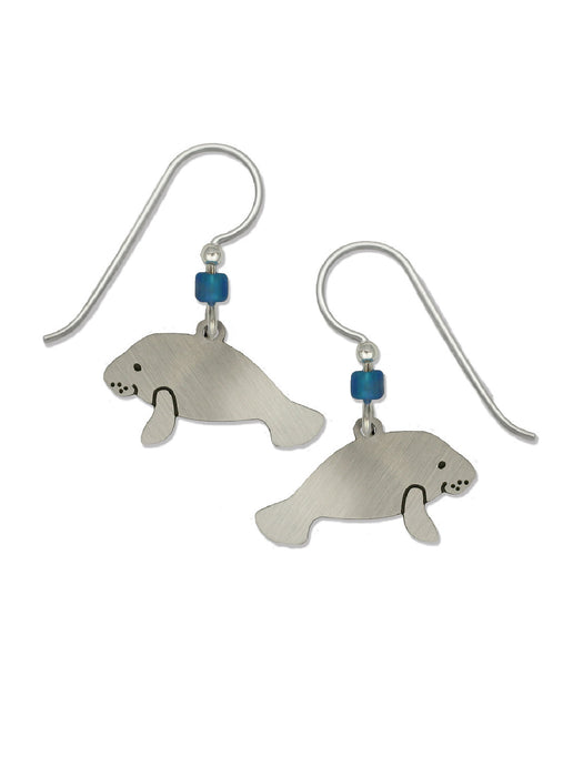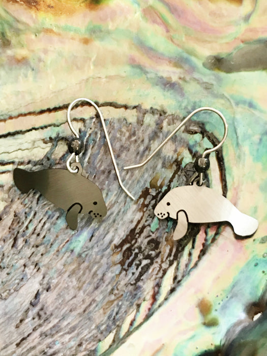 These happy manatee earrings are cut from lightweight metal and given a brushed finish.
