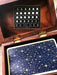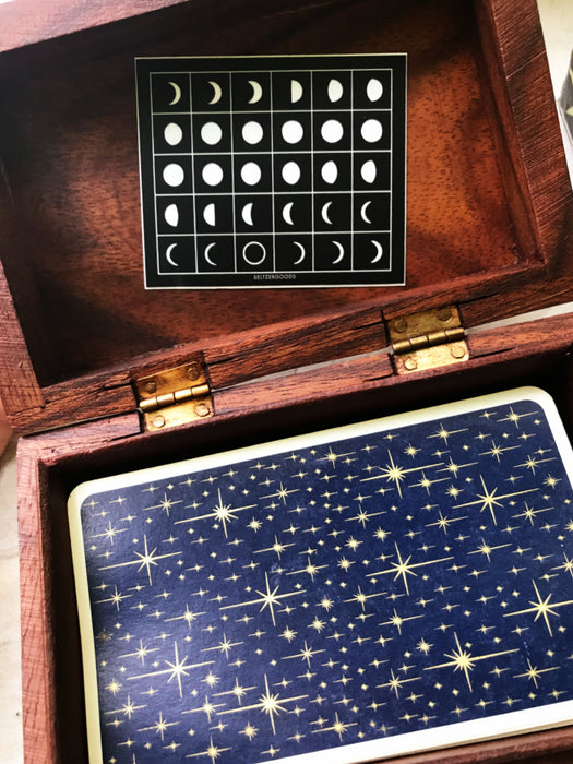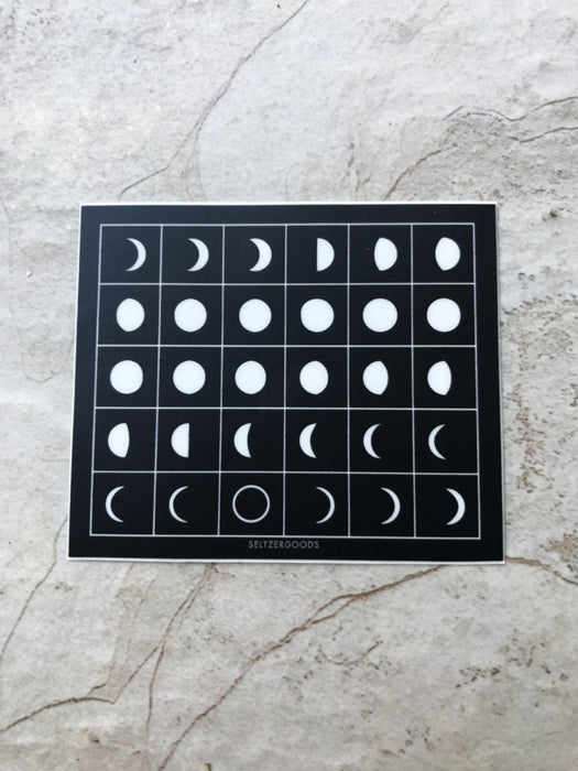 This sticker is a chart of the lunar month, or phases of the moon, in white on a black background. Water-resistant stickers are perfect for your water bottle, laptop, or anywhere needing some extra flair! Made in the USA.