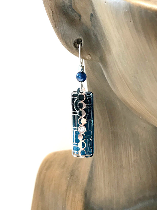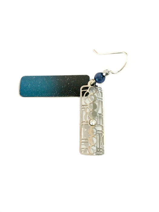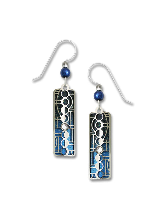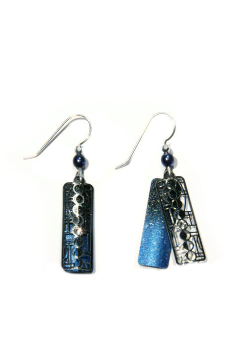 These awesome dangles are two layered pieces: the top has a silver cutout moon-phase design with a crystal representing the full moon, backed with a glittery black-to-blue enamel bar for the night sky.