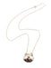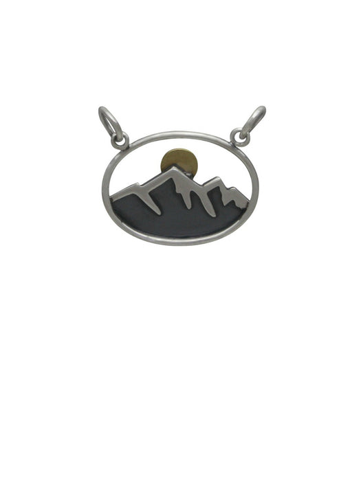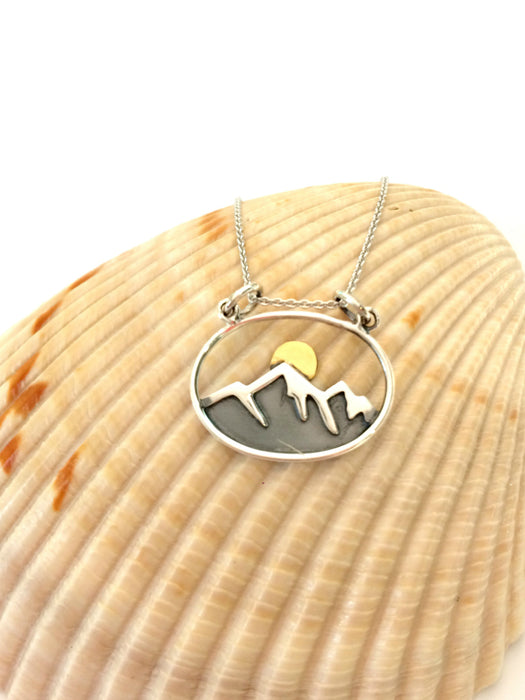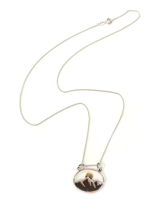 A golden sun rises over a detailed mountain range set in an oval pendant. The chain passes through two bails for a unique hanging style.