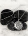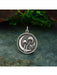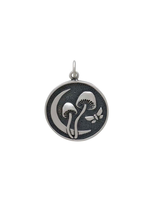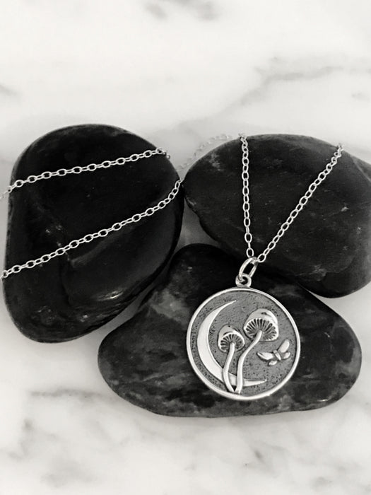 This necklace features a pendant embossed with a mystical nighttime scene of a crescent moon, mushrooms & a moth.