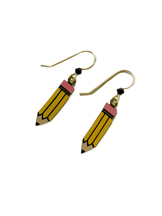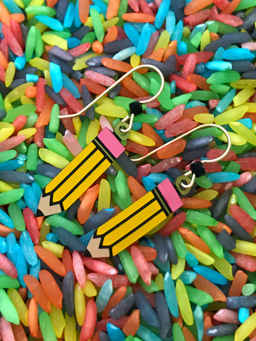 These whimsical pencil earrings are handmade using lightweight metal and vibrant enamel.