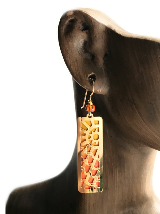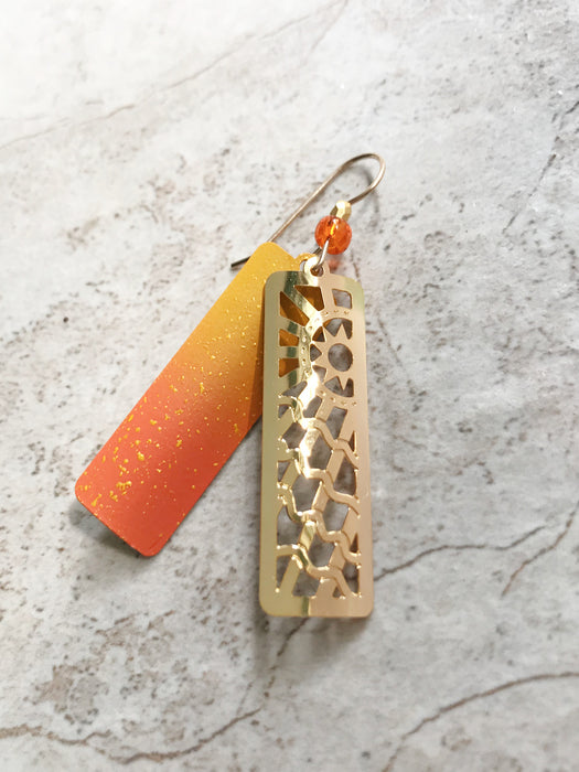 These statement earrings feature a long steel column enameled in orange and yellow ombre with a gold overlay of a sun cutout.