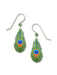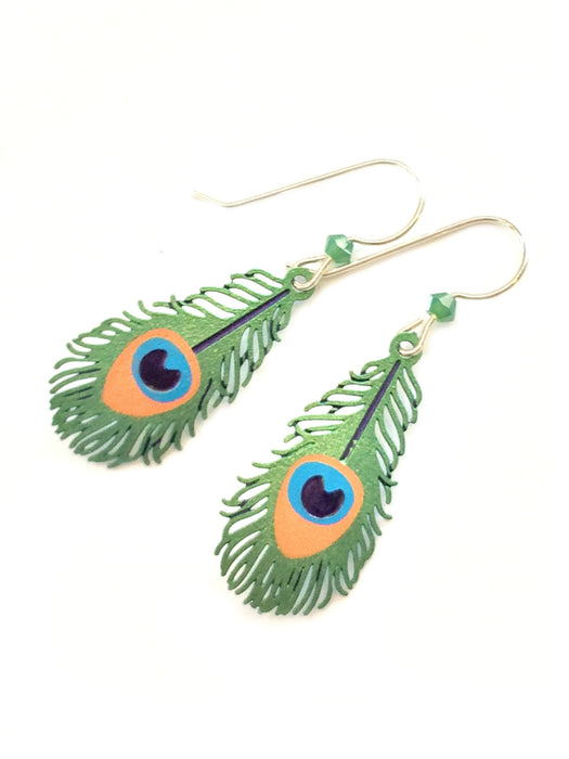 These whimsical earrings feature a detailed peacock feather, enameled in brilliant colors with a soft metallic finish.