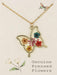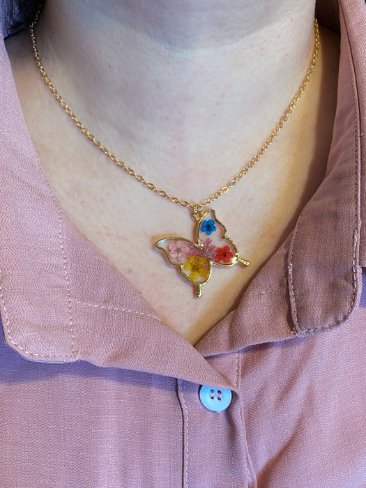 This lovely necklace features a butterfly pendant with real dried miniature flowers pressed in acrylic and edged in gold.