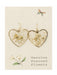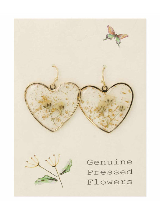 These romantic statement earrings are crafted with real baby's breath flowers & gold flakes preserved forever in acrylic and cast into hearts lined with gold.