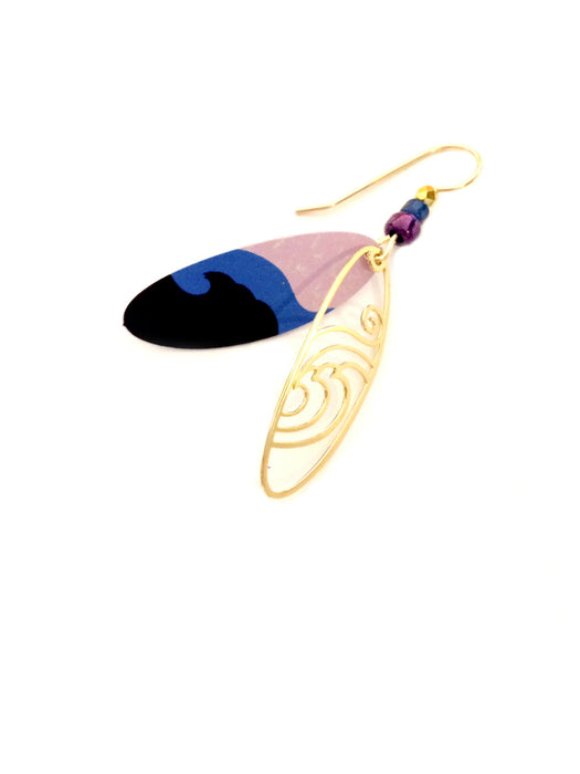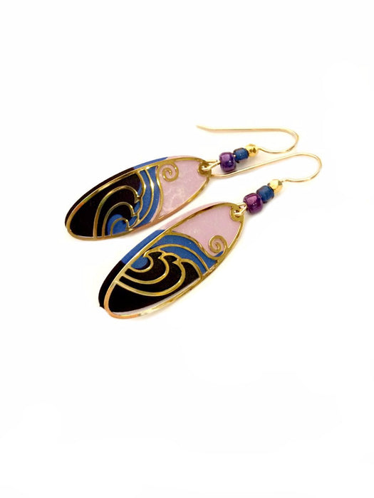 These stunning earrings feature an oval enameled in rich shades of purple and blue and overlaid with a gold cutout wave design.