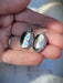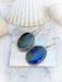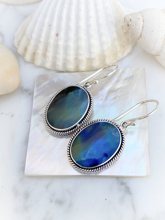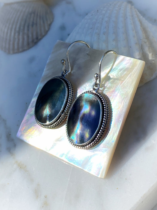 These dangle earrings feature beautiful ovals of black mother of pearl shell, surrounded by classic rope border. Made in Bali.
